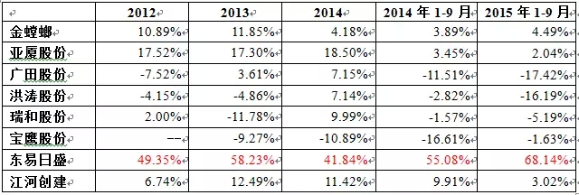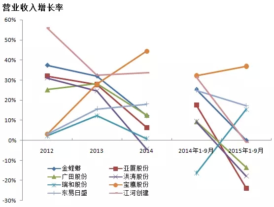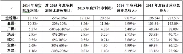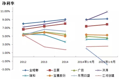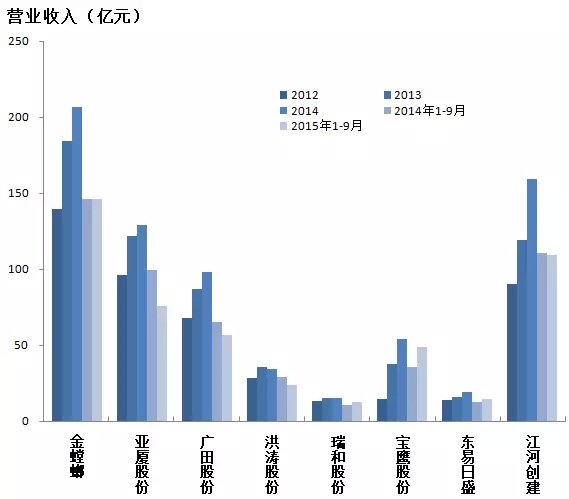 注:营业收入以2014年净利率计算,金螳螂、亚厦、广田、洪涛、瑞和、宝鹰及东易日盛2015年1-6月净利率分别为9.07%、7.99%、5.48%、8.71%、3.60%、4.99%和6.19%。江河创建数据未公布,故不计入。