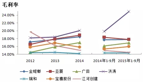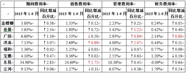 毛利率方面,各公司毛利率较去年同期有增有减,但幅度不大。洪涛股份的毛利率提高5.15个百分点24.93%,幅度较大,主要是由于跨考教育、学尔森相继完成股权转让及相关工商更变登记,并已正式并表。而同类公司的毛利率高达50%以上,使得公司毛利率大幅增长。预计四季度由于教育等新业务占比的不断扩大,公司毛利率将进一步提升。金螳螂、广田股份及宝鹰股份毛利率小幅上涨。亚厦股份毛利率连续两个季度出现下滑,主要是由于母公司收入规模持续收缩,综合毛利率较低的子公司业务收入占比逐渐提升,导致公司的综合毛利率持续回落。东易日盛毛利率出现小幅下滑至35.53%,但依旧维持较高水平。由于市场竞争激烈,江河创建主营业务幕墙和内装毛利率纷纷下降,导致整体毛利率出现小幅下滑。