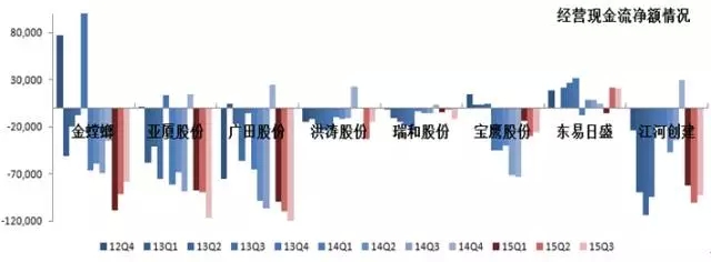 从盈利能力和经营活动现金流量综合来看,与去年同期相比,金螳螂、洪涛、瑞和及江河创建均净利增加,但经营活动现金净流出进一步扩大,主要是由于应收账款和存货大量增加,表明各公司可能以更加宽松的信用交易条件来提高销售,进而美化获利,另外也彰显出各公司以销售取得经营活动现金的能力大幅降低。亚厦和广田均净利减少,且经营活动现金净流出不断扩大,表明此时公司面临主营业务面临较大问题,转型成果急需为公司带来收益。宝鹰净利增加,经营活动现金净流入增加,表明宝鹰整体运营状况良好,应收账款和存货的增长控制较为得当。而东易日盛的净利减少,经营活动现金净流入却增加,这与木作工厂整体搬迁,而搬迁过程中导致的客户产品延期、赔付等有关。