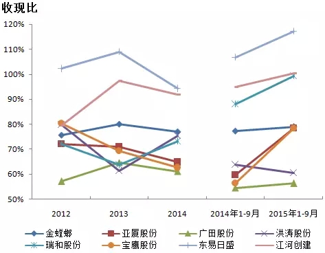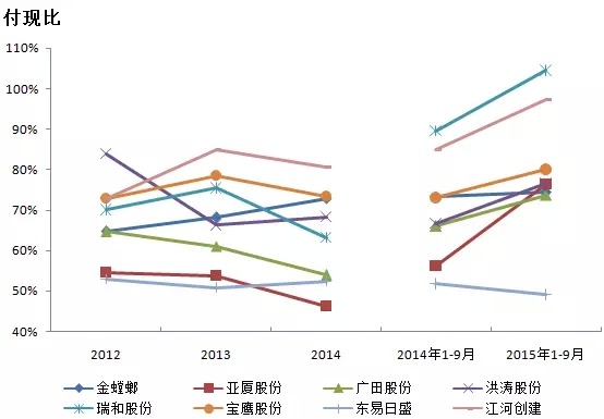 收现比方面,除了洪涛外,其他各公司的收现比较去年同期有上升趋势。付现比方面,除东日易盛外,其他公司付现比均有明显上升,一方面表示各公司已经加快回款催收,回款情况越来越好;另一方面表明在行业整体情况处于低潮期,资金链紧张的情况下,各公司的供应商对资金回款都有一定的要求,各公司很难将资金压力转移到供应商。