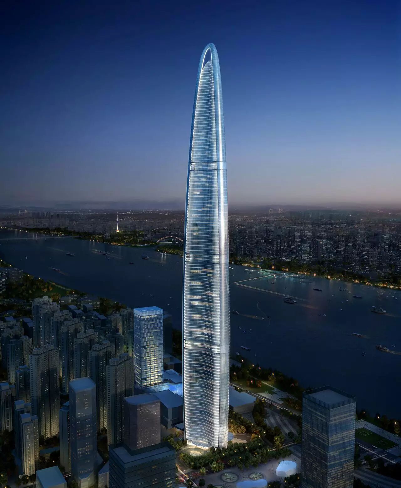 原规划606米、“世界第三、中国第二、中部第一”的武汉绿地中心,毗邻武汉长江隧道至武汉长江二桥之间武昌江边,2010年12月8日正式开工建设,预计2017年完工。