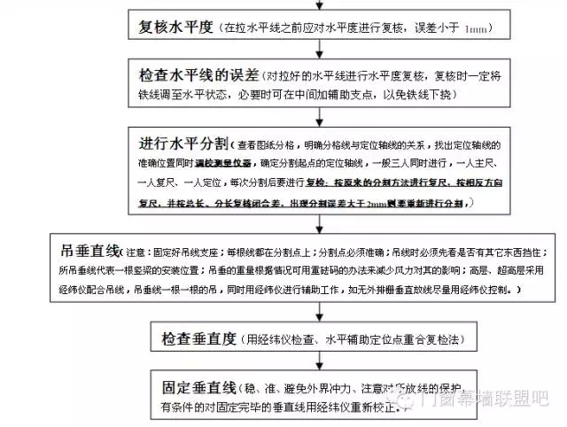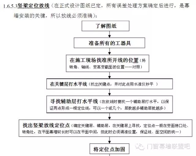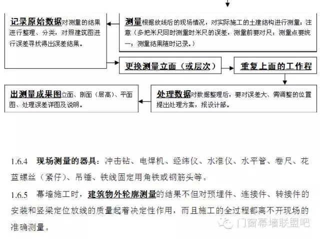 1.6.5.4弧形、折线形的幕墙为保证其曲率和效果面,采取模板放线方法,故模板加工的准确是保证放线方法准确的前提,注意:寻找辅助层抄平安装模板支架,模板位置及调整、固定等(模板固定时要用铁线将其与支架紧紧固定在一起,千万不要移动模板或损坏模板)。