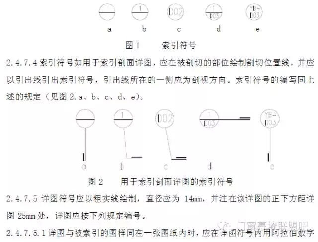 2.4.7.2.2在一张图纸中有二个或二个以上图样时,应在索引符号的上半圆中用阿拉伯数字注明该详图在此图纸上的编号,并在下半圆注明该详图所在图纸的图号(见图1.d)。