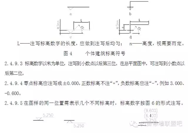 2.4.9.2标高符号的尖端,应指至被注的高度。尖端可向下,也可向上(见图5所示)。