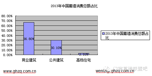 从市场应用看,随着中国城市化进程的快速推进,数量庞大的大型公共建筑、商业楼宇及高端住宅不断涌现,是近年来中国建筑幕墙需求快速增长的重要原因。从2013年的幕墙招标统计信息看,商业建筑在中国幕墙消费总额中占比最大,约占66.80%;其次是公共建筑,约占30.10%;高档住宅占比最小,约为3.1%。