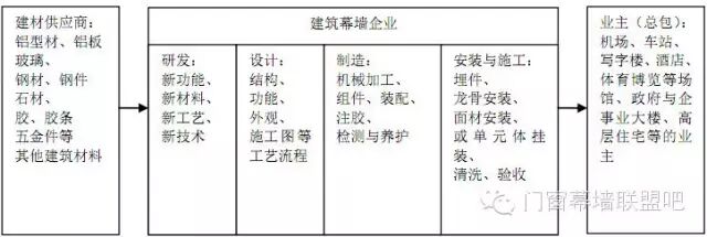 在产业链上,幕墙企业介于建筑业主(或建筑总包)与建材供应商之间,其下游的业主对大型建筑工程的投资建设决定了建筑幕墙的市场需求,总包则负责建筑主体工程建设并协调相关专项分包商,对幕墙企业有重要影响;其上游则是铝型材、玻璃、钢材、石材、胶等各类建材企业。综合性的建筑幕墙企业除了具有施工企业的一般特点外,还具有轻型机械制造企业和设计院的基本特征,幕墙行业也因此成为建筑业里最具技术含量的产业,其与上下游的产业关联关系表示如下: