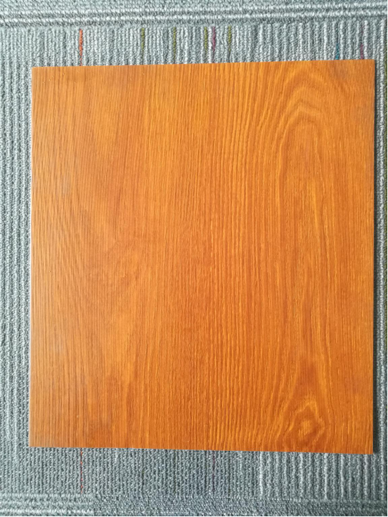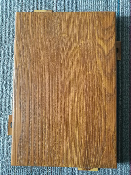 热转印木纹铝板的加工流程为:铝板成型→铝板表面前处理→喷粉→包覆木纹纸→高温烘烤→表面清洁→贴面保护。