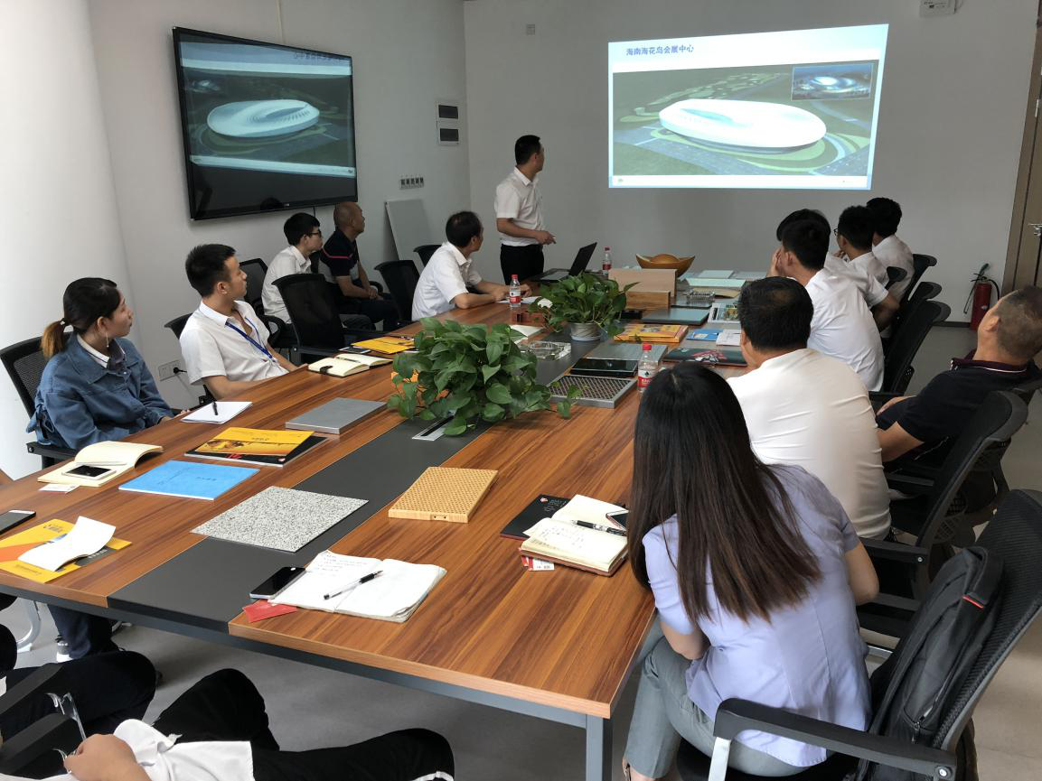 交流会上王总介绍了中港集团的发展历程和企业实力,并结合视频、样品和相关PPT详尽地对我司生产的铝单板、天花方通、仿木纹、仿石纹铝板、蜂窝铝板及双曲铝板的产品特性、加工工艺、技术要求及应用前景等做了介绍。