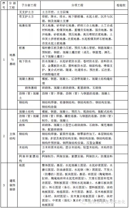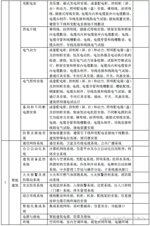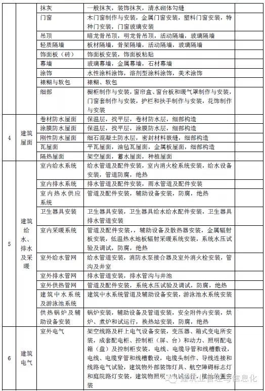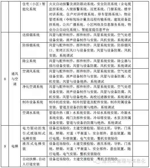 共划分为:一、地基与基础工程;二、主体结构;三、建筑装饰装修;四、建筑屋面;五、建筑给水、排水及采暖;六、建筑电气;七、智能建筑;八、通风与空调;九、电梯